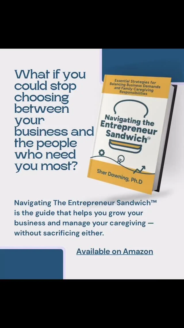 Purchase my book — Navigating The Entrepreneur Sandwich™: Essential Strategies for Balancing Business Demands and Family Caregiving Responsibilities is your practical guide to managing it all without burning out — written by someone who has lived it, researched it, and built a framework around it just for you.
